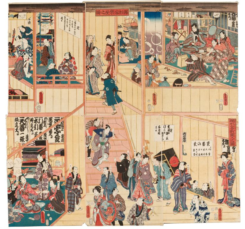 Japán, Edo-kor, 1856. 2. hónap, hat lapból álló színes fametszet; két háromlapos kompozíció