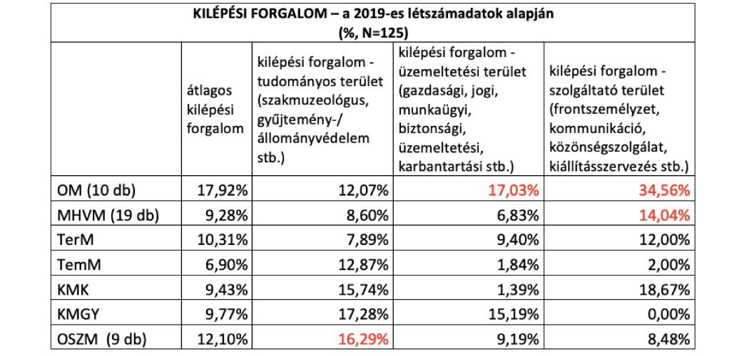 A kérdőív intézményi adatai alapján számolt kilépési forgalom kifejezi, hogy egy munkatársra hány kilépő munkatárs jut. Az 5-15% körüli mutató egészséges mértékű ’vérfrissülést’ jelez a szervezetben. Elmondható, hogy a kilépési forgalom az 5%-ot majdnem minden területen eléri. Kivételt a tematikus múzeumok és a közérdekű muzeális kiállítóhelyek esetében az üzemeltetési terület, illetve a tematikus múzeumok és a közérdekű muzeális gyűjtemények esetében a szolgáltató terület jelent. Esetükben félő, hogy a szaktudás nem frissül.