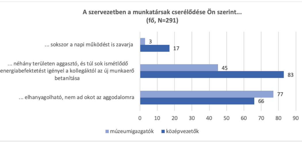 A kérdőíves válaszok alapján a középvezetők 50%-a néhány területen aggasztónak tartja a fluktuációt, a múzeumigazgatónak csupán 36%-a aggódik, és 62%-uk elhanyagolhatónak tartja a munkatársak cserélődését. Míg a középvezetők 10%-a szerint a napi működést is zavarja a sok ki- és belépés, a múzeumigazgatók közül ezt alig néhányan (2%) észlelik hasonlóképpen.