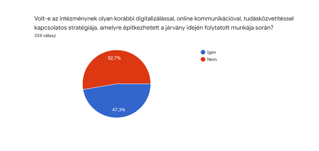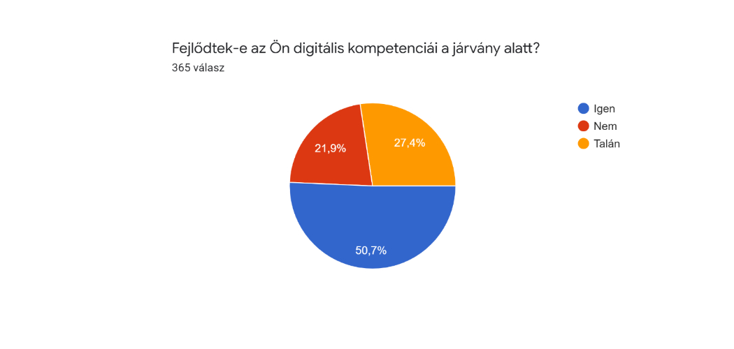Egy biztos a válaszadók több mint fele (185 fő) úgy érzi, hogy digitális kompetenciái fejlődtek a járvány időszakában. A válaszadók számos új alkalmazás kezelésében is elmélyedtek, a különböző konferenciákra alkalmas programok mellett, többféle múzeumpedagógiai és andragógiai célú, virtuális kiállítások rendezésére alkalmas fejlesztést kipróbáltak.
