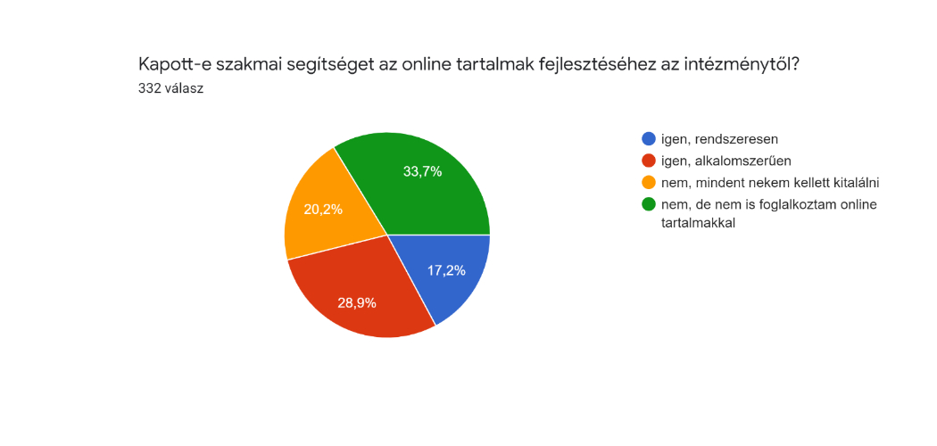 A munkavállalók jelentős része ezen a területen alapvetően minimális szakmai támogatást sem remélhetett saját intézményétől. A 332 válaszadó közül mindössze 57-en kaptak rendszeresen segítséget, 67 főnek alapvetően mindent saját magának kellett kitalálni, 96 pedig alkalomszerűen számíthatott aktív szakmai támogatásra. Így jobb híján 157 fő a kollégáktól gereblyézte össze a tudásmorzsákat, 107 fő bemutató videókra, 56 oktató programokra épített, 53 a barátikörétől kért segítséget, 12-en a családi kapcsolataikat használták ki, és ami alapvetően újdonság: 41 adatközlő a gyerekeitől kapott tanácsot és gyakorlati útmutatót.