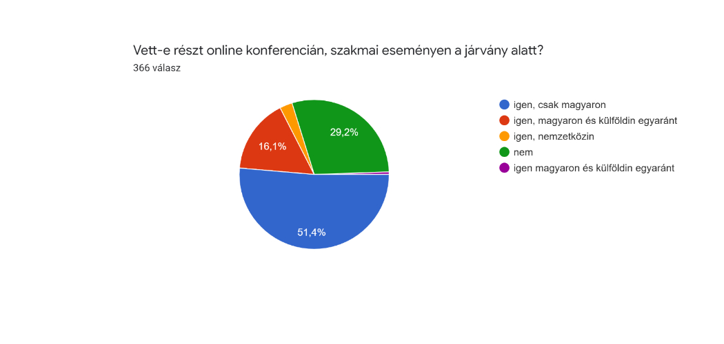 Ehhez nagyban hozzájárultak a különböző szakmai események. 366 válaszadó 51,4 százaléka vett részt magyar, 2,7 csak nemzetközin, 16,1 pedig magyar és külföldi konferencián, workshopon. A Restart, a MuseumDigit, a Múzeumandragógiai Konferencia, a Europeana Aggregators Forum, a MAPS, a MuseumNext, a Ludwig Múzeum Hymexe, a Néprajzi Múzeum új kiállításaival kapcsolatos nemzetközi tanácskozása, az egyes szakágak tudományos eseményei épp olyan hatékonyak voltak a helyzet kezelésében, a folyamatos fejlesztésekben, mint a kötelező vagy választható online továbbképzések, tanfolyamok (gyakran említett: a Pulszky Társaság Múzeumi iránytű sorozata, a természetvédelmi eseményt előkészítő Beporzó szalon vagy a kis intézmények számára életmentő Tájházi Műhely).
