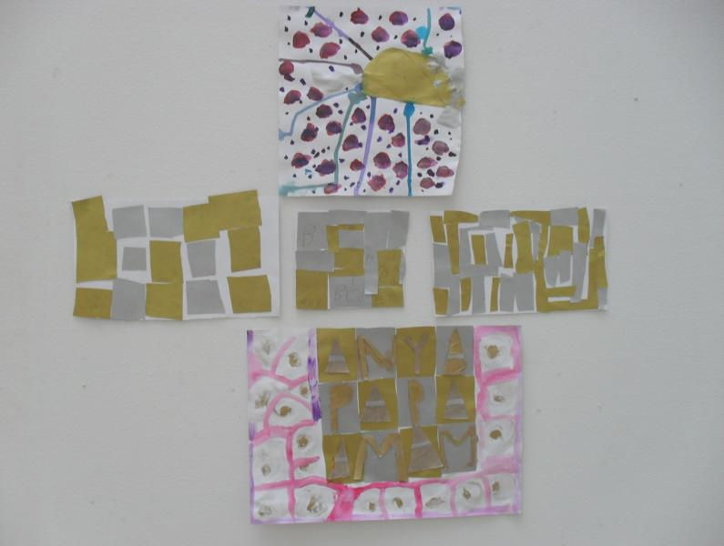Magyarics Flóra (9 éves) a Kézjegy c. kiállítás alkotó-foglalkozásán az Anya, Anya, Mama c. művek kompozíciós- és ritmusjátékának megélése, valamint tartalmi- és vizuális továbbgondolásának közepette.