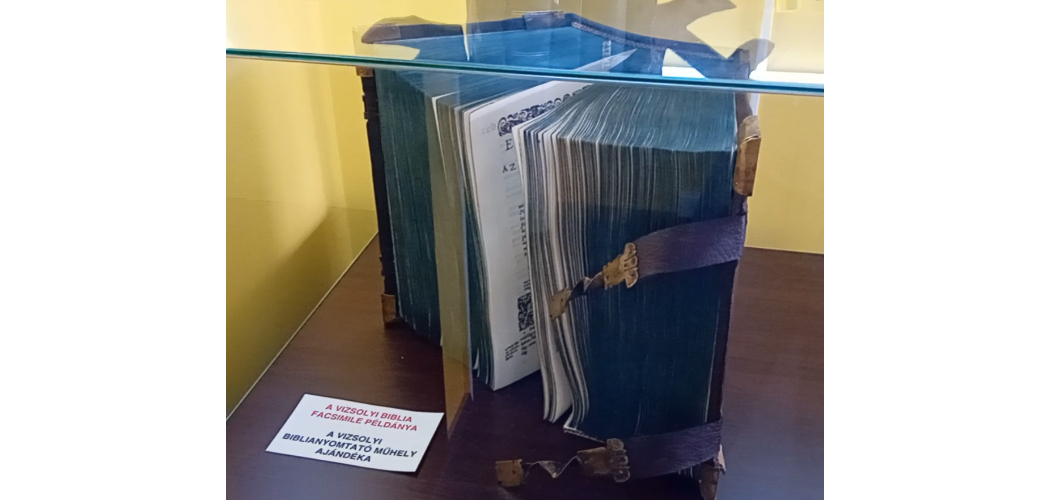 A Biblia mellett egy tablón láthatjuk a vízjeles papírok képeit, amelyeket a Biblia nyomtatásához használtak fel.