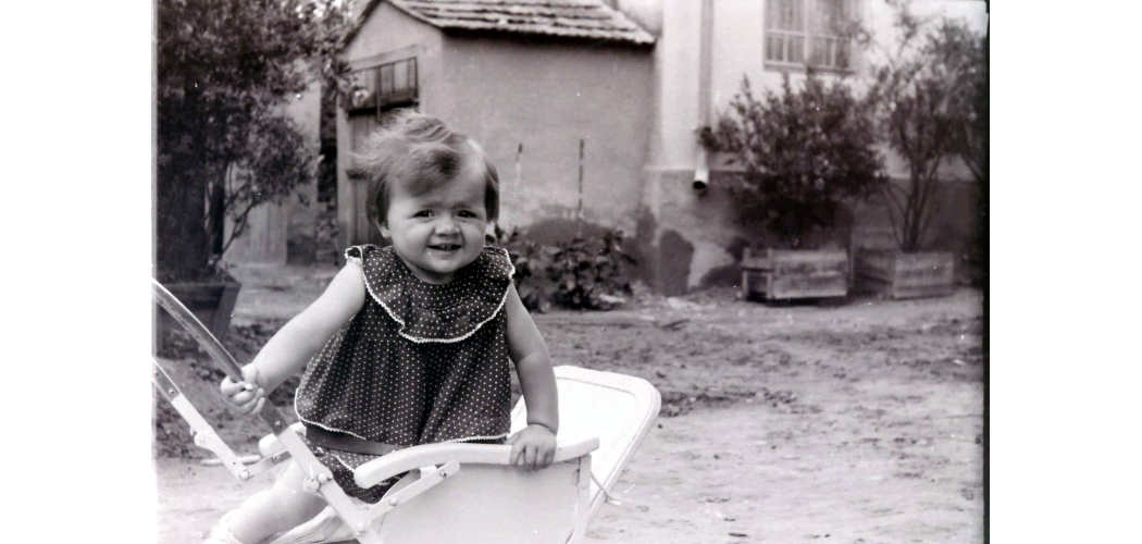Nemrég Kovácsné Csonkás Erika Veronika pedagógus, amatőr fotográfus jelentkezett egy gyermekkort felidéző nagyszerű tárggyal. A pandémiás időszaknak akad némi pozitív hozadéka is, több ideje felszabadult a tanárnőnek, így számos alkalommal járt a Zala megyei pusztaszentlászlói nagyszülői háznál. A padláson talált néhány régi játékot, többek között egy kis babakocsit, ami az akkori 1950-60-as években használt valódi tárgy kicsinyített mása. A színes fotón a játékszer, míg a korabeli fekete-fehér fotográfián Csonkás Erika Veronika látható az igazi babakocsiban 1955-56 körül, háttérben a nagyszülők háza sejlik fel. A babakocsit nem tartották meg, hanem továbbadták, ahogy az lenni szokott a babakelengyékkel és a kisdedholmikkal. Akár baráti körben, akár családban maradt az elajándékozott tárgy, mindenki boldog volt a megörökölt kellékekkel.