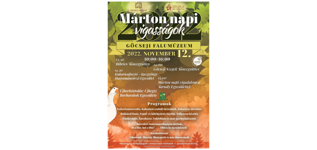 Aki velünk tart, minden fontos hagyományt és jóslást megtudhat a szombati rendezvény alatt. Aki pedig nem tud Zalaegerszegre utazni, az ne feledje, hogy Zalalövőn úgy tartották: „aki Márton napján ludat nem eszik, ehetik az bármit, mégis éhezik.” Bárhol is járnak, kerüljön a bendőbe aznap némi libaétel!Sok szeretettel várunk mindenkit november 12-én a Márton-napi vigasságokon Zalaegerszegen, a Göcseji Falumúzeumban!