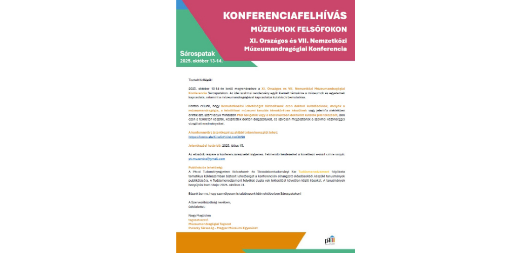 Publikációs lehetőség: A Pécsi Tudományegyetem Bölcsészet- és Társadalomtudományi Kar Tudásmenedzsment folyóirata tematikus különszámban biztosít lehetőséget a konferencián elhangzott előadásokból készülő tanulmányok publikálására.