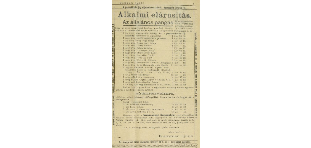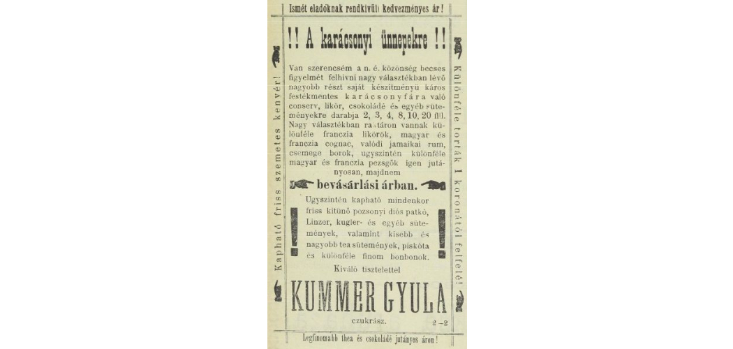 Az ünnepek előtt néhány nappal a kereskedő bevallotta, hogy óriási árukészletet halmozott fel. Ma már szinte mosolygunk a városi hetilapban 1902. december 18-án megjelentetett mondatán, de titkon vágyakozhatunk erre a naiv őszinteségre: „Az általános pangás és a nagy árufelhalmozás folytán azon helyzetbe jutottam, hogy az alább megnevezett borokat, pezsgőket, likőröket és a többi italokat csaknem beszerzési áron ajánlhatom a nagyérdemű közönségnek.” Innen a jövőből már csak bízni tudunk, hogy Kummer Gyula cukrász el tudta adni a portékáit és sok zalaegerszegi polgár karácsonyi asztalára felkerültek a finomságok.
