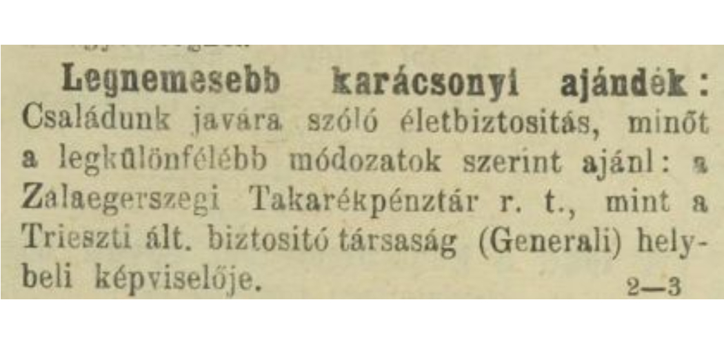 De nézzük, mit kínáltak még a zalaegerszegi kereskedők karácsonyi ajándékként. A jelenlegi Göcseji Múzeum épületét eredetileg takarékpénztárnak építették. A csoport a következő hirdetést jelentette meg a Magyar Paizsban: "Legnemesebb karácsonyi ajándék: családunk javára szóló életbiztosítás, minőt a legkülönfélébb módozatok szerint ajánl a Zalaegerszegi Takarékpénztár, mint a Trieszti általános biztosító társaság helybeli képviselője." Nem tudjuk, mennyire volt kelendő ez az ajánlat, mai szemmel meglepőnek és furcsának tűnik az ötlet, de az is lehet, hogy csak előrelátó volt.