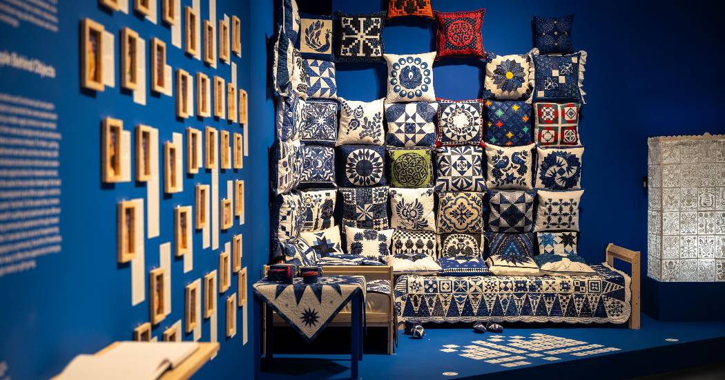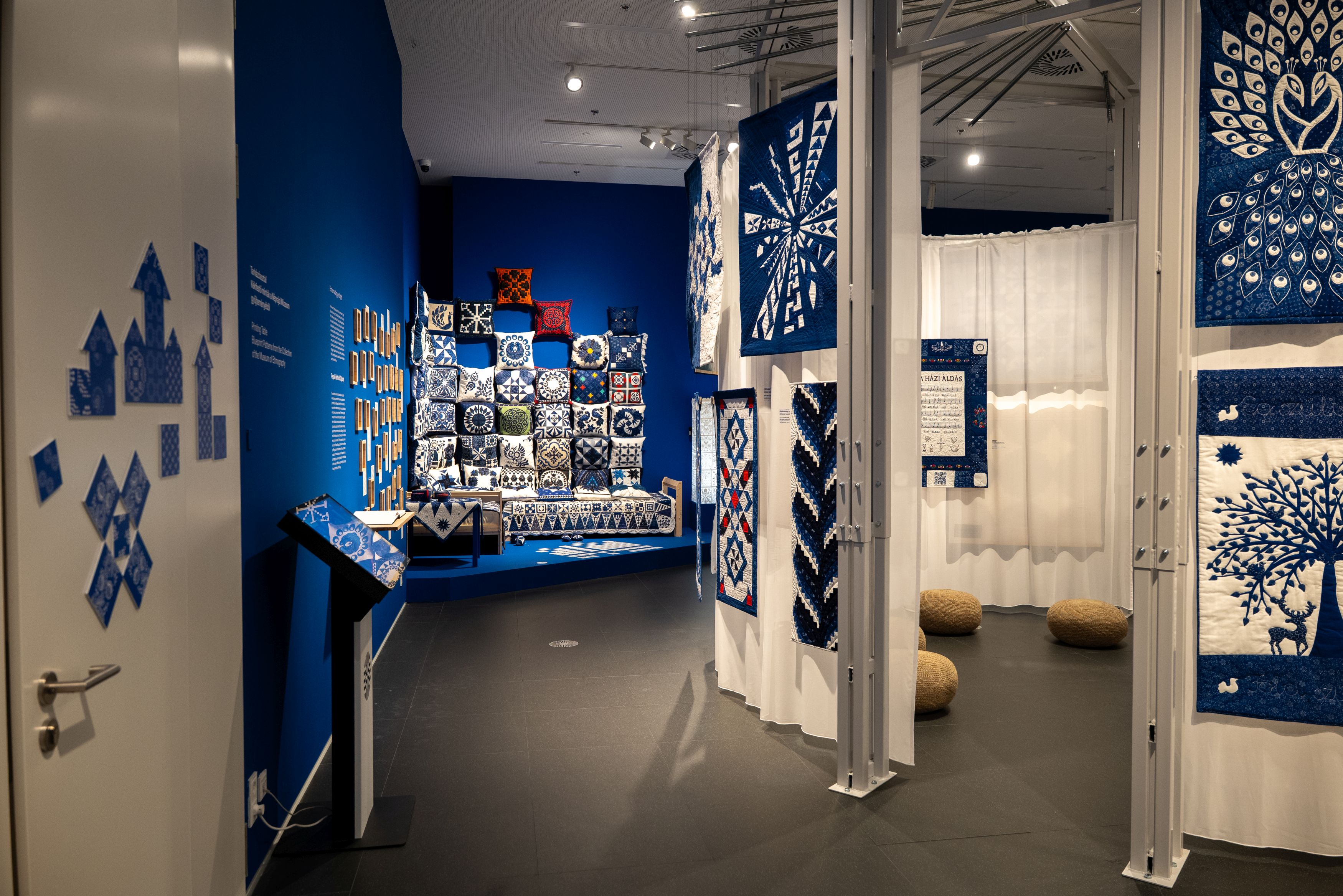 A gyönyörűen színhangolt, szépen elrendezett kiállítás Budavári Veronika kurátor ízlését és szakmai elkötelezettségét dicséri, a válogatás célja, bebizonyítani, hogy a foltvarrásnak - ebben a narratívában különösképpen - helye van az etnográfiában. Faliképek és párnák, házi áldás terítők és patchwork kitűzők, anyag- és dúcminták, valamint kiállítási csúcstárgyak szegődnek útitársunknak a bevezető folyosó két oldalán futó foltvarrás és kékfestő történeti úton, és válnak idegenvezetőinkké a technikákat, a nemzetközi és magyar példákat analizáló falak, a Nagyjainktól örökül kékfestő pályázat anyagát bemutató központi tér, valamint a - szintén ebből a portfólióból táplálkozó - enteriőr sarok mentén, a benne stílusosan feltornyozott, kollektív kultúrtörténetünket jelképező vetett ággyal. A pályázat munkái és a Foltvarró Céh alkotásai olyasfajta közösségi szemléletet tükröznek, mely révén a kiállított tárgyak nem elszigetelt művekként, hanem egy közös gondolkodás lenyomataiként szólalnak meg - minden darab mögött egy-egy alkotói úttal, minden tárgy mögött meg- és átélhető kollektív részvétellel.