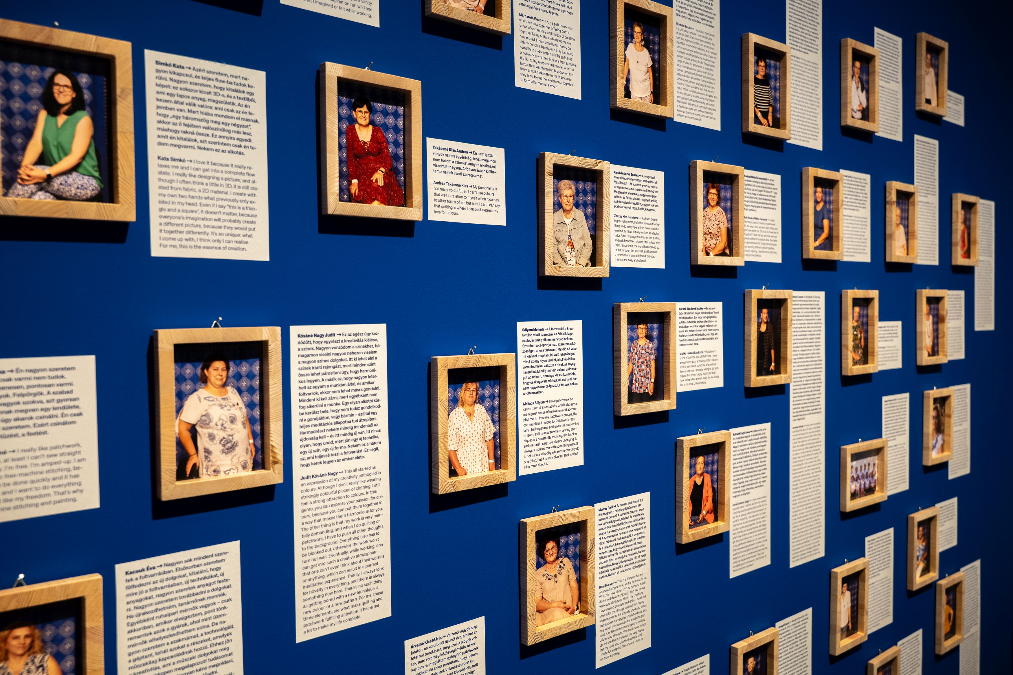 A kékfestő anyagok patchwork-munkákban való újragondolása finom párbeszédet hoz létre hagyomány és kortárs alkotás között: az ismerős minták új összefüggésbe kerülnek, a különböző korú, eredetű textildarabok pedig éppen úgy találkoznak egymással, amiként egymásba fonódnak a foltvarrók történetei – ezt a különleges réteget, mint egyfajta subtext, mögöttes tartalom erősítik a kiállításban látható, nézhető, hallgatható filmek, melyeket Budavári Veronika, Csorba Judit Dorottya, Incze László és Nickl Márton készítettek, arcot, hangot adva velük az egymásba álmodott anyagok mögött pulzáló sorsoknak, külön értelmet adva szín- és anyaghasználatnak, motívumoknak, keletkezési dátumoknak. A foltvarrás történetileg női terekhez kapcsolódik, mely dimenzió a kiállításban is hangsúlyosan jelen van, de korántsem ideologikus módon, hanem a közös munka, az egymásra figyelés, a tudás megosztása révén, a filmek okán pedig: a fel-meg- és bemutatás céljával. A részekből összeálló egész gondolatisága a Néprajzi Múzeum falai között nem csupán a kiállított textilekre igaz, hanem a mögöttük szentesült emberi kapcsolatokra is.