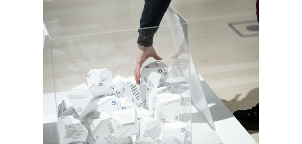 Nagy Barbara: A tematikus egységek kialakításakor figyelembe vettük a Ludwig Múzeum gyűjteményének karakterét, valamint a kérdés-csoportokat, amelyeket a kiállítás előtt a pedagógusoktól kaptunk. Az egyes terek témáját befolyásolták továbbá a modern és kortárs művészet számára releváns kérdések. Az első, az „Ez miért művészet?” című térben három provokatív alkotást helyeztünk el. Ezek közül kettő, Tót Endre és Borsos Lőrinc alkotásai - amellett, hogy vicces és merész formában hívják fel a néző figyelméta kiállításban megfogalmazott kérdésekre, kapcsolatot is teremtenek a múzeumban őrzött más művekkel, mint Pablo Picasso Muskétás című kompozíciójával, vagy Bak Imre alkotásaival.