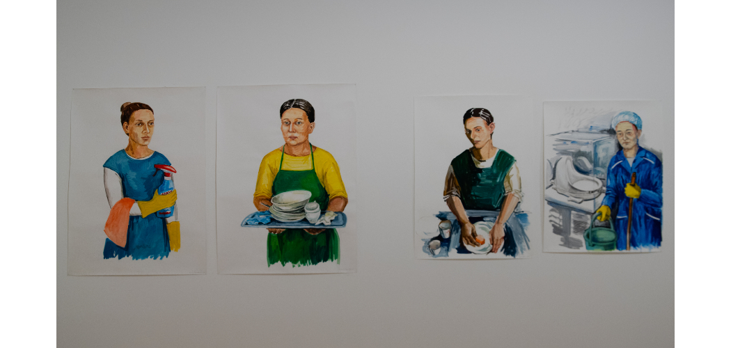 A gondoskodás kapcsán a kiállítás felhívta a figyelmet a láthatatlan munkára is, hiszen általában ezek is gondoskodási feladatokkal függnek össze, és sokszor annak ellenére sem ismerik el őket, hogy a társadalom mozgatórugói. Ezzel foglalkozik Okszana Brjukovecka ukrán művész Munka, munka, munka című festménysorozata is. Képein nőket látunk, akik munkájának hasznossága vitathatatlan, mégis anyagi, vagy egzisztenciális megbecsültségük rendkívül alacsony. Megjelenik a képeken például a tanárnő, mosogatónő, vagy a múzeumi takarítónő, akit Marcel Duchamp híres piszoárja előtt ábrázol.