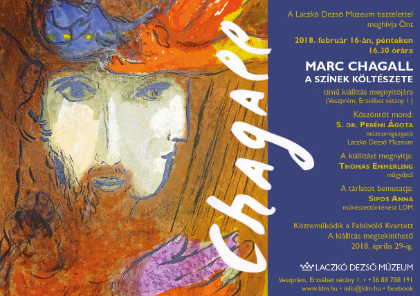 A Laczkó Dezső Múzeum 2018 februárjában nyitja legújabb, képzőművészeti kiállítását, mely a sokszínű és álomszerű képeiről ismert Marc Chagall alkotásaiból válogat. A vendégeket köszönti S dr. Perémi Ágota múzeumigazgató, a kiállítást megnyitja Thomas Emmerling, műgyűjtő. A kiállítás kurátora Sipos Anna művészettörténész.