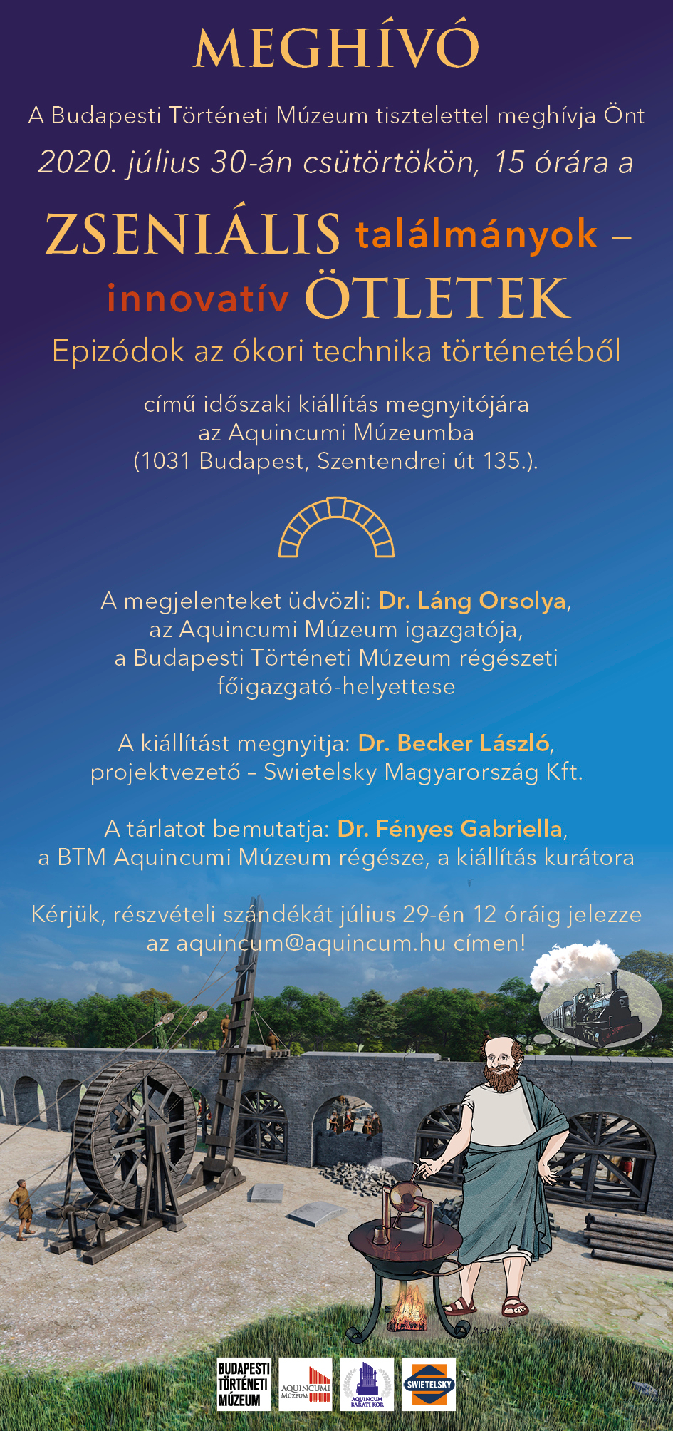 2020. július 30-án csütörtökön, 15 órakor hosszú várakozás után végre megnyitja kapuit a Zseniális találmányok - Innovatív ötletek: Epizódok az ókori technika történetéből új időszaki kiállítás az Aquincumi Múzeumban. A tárlat az antikvitás egy igazán izgalmas világába kalauzol, olyan kérdésekre is választ kaphatunk, hogy mi a közös az orgonában, a "környezetbarát autóban" és a kotyogós kávéfőzőben. Nemcsak megismerhetjük, de akár ki is próbálhatjuk az elfeledett ókori találmányokat.