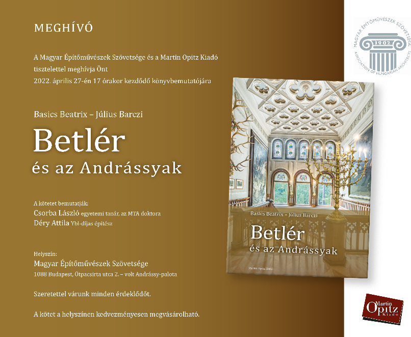 Április 27-én mutatják be Basics Beatrix és Július Barczi Betlér és az Andrássyak című könyvét a Magyar Építőművészek Szövetsége és a Martin Opitz Kiadó szervezésében. A meghívó mellett közöljük a könyv ismertetőjét is.