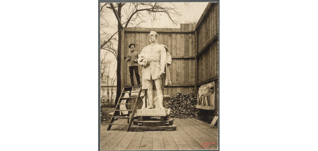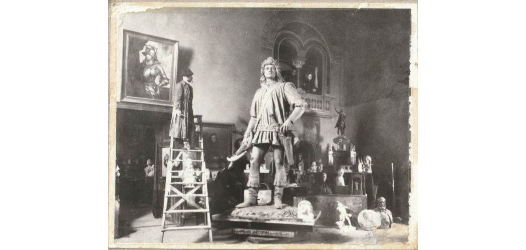 Strobl Alajos a készülő szegedi Széchenyi-szoborral az epreskerti műtermében, 1912, Archív fotó, MKE Könyvtár