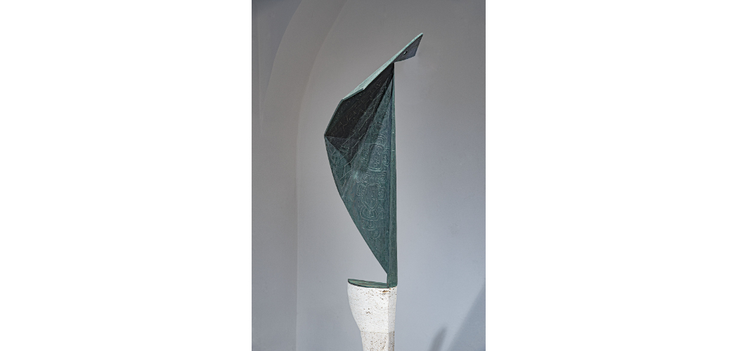 Kalmár János: Metaxu VIII., 2022 bronz, mészkő, 197×43×29 cm