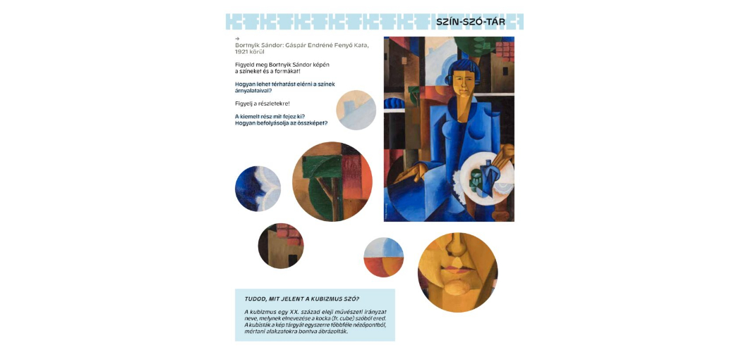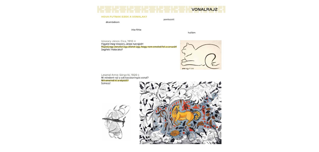 Ahogy először végiglapoztam a füzetet, olyan érzésem támadt, mintha egy módszertani ötlettárat tartanék a kezemben. Igaz, hogy konkrét kiállításhoz, adott műalkotásokhoz (Rippl-Rónai József, Bortnyik Sándor, Ferenczy Noémi, Lesznai Anna csodálatos munkái) kapcsolódnak a témák, kérdések, gondolatok, mégis a megközelítés strukturáltsága és a többnyire nyitott kérdések sokfélesége fogott meg. A vonal – szín – forma – anyag témakörök mentén építkező, a művek átfogó elemzése helyett egy-egy részletre, példára vonatkozó kérdések a kortárs műalkotások megfigyeléséhez, felfedezéséhez és megismeréséhez, a művekhez való személyes kapcsolódáshoz kínálnak vezérfonalat.