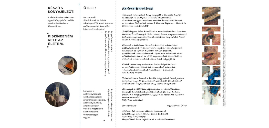 Bár elsőre nem tűnik fel, valójában két füzetet kapunk egyben: az egyik borítótól indulva „kicsiknek” – viszonylag tágan kezelt kategória, 3-14 éves korig – a másik oldalról pedig „nagyoknak” kínál megfigyelni, nézni és gondolkodni valókat a minőségi papírra nyomott, többnyire jól szerkesztett, színes oldalakból álló kiadvány. Bármely irányból indulunk is el, az oldalak, oldalpárok az „A főváros képtára. Művek és történetek” című időszaki tárlaton szereplő műalkotásokat ismertetik közelebbről, és végül mindkét út Kosztolányi Dezső verséhez vezet.