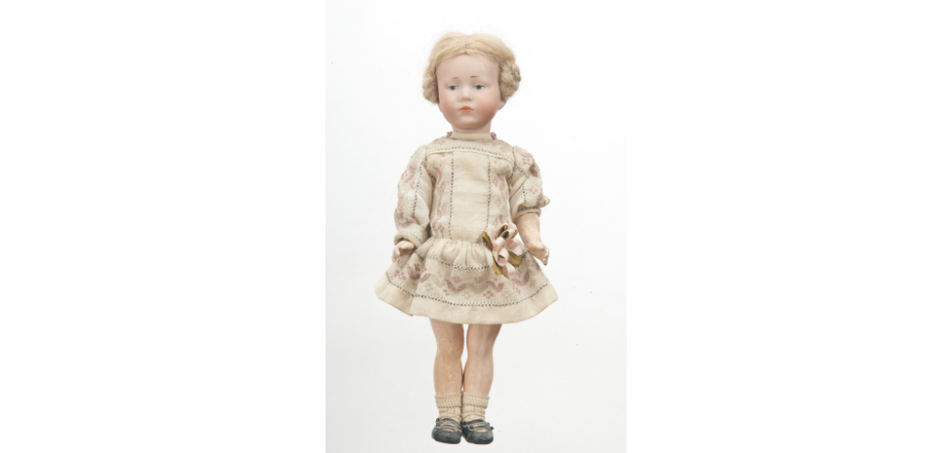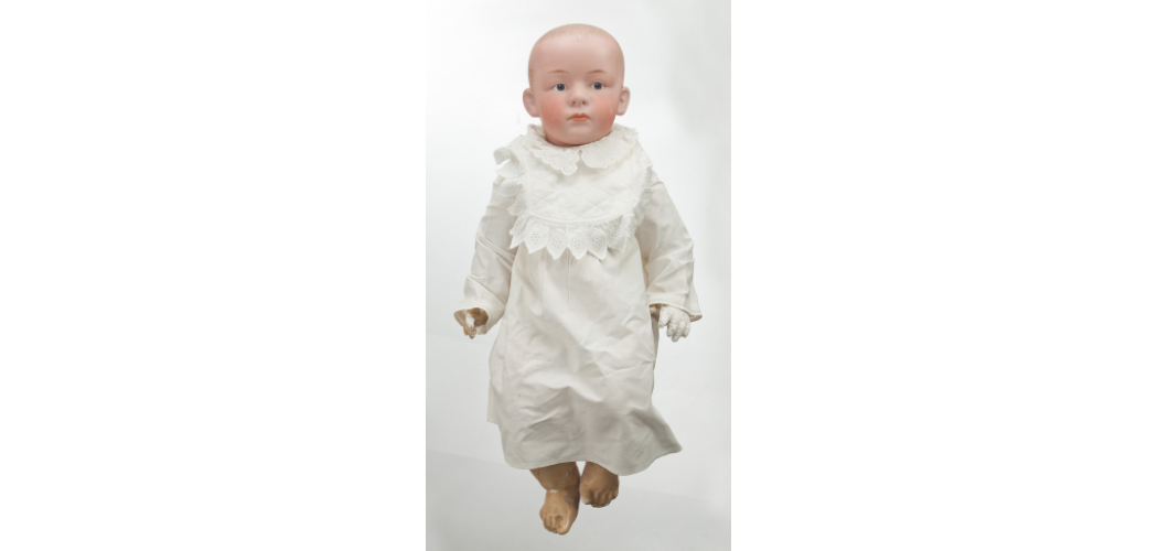 Biszkvitporcelán fejű csecsemőbaba „Péterke”. 1912. Gebrüder Heubach, Lichte (Türingia, Németország). Hetedhét Játékmúzeum, Moskovszky-gyűjtemény. (Fotó: Kiss László)