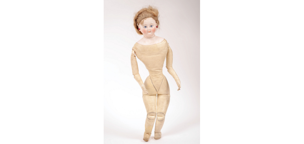 A feje biszkvitporcelán, a teste bőr. A biszkvitporcelán a fényes felületű mázas porcelánnal ellentétben egy matt felület, amely sokkal jobban hasonlít az emberi bőrre, és a korban divatos fehér bőrszínt kiválóan érzékelteti. Az üvegszem és a valódi hajból készült paróka fokozza a vaslósághűséget, amely a 19. században minden játékkal szemben fontos elvárás volt. Ruha nélkül is jól látszik ezen a babán, hogy felnőtt nőt ábrázol.