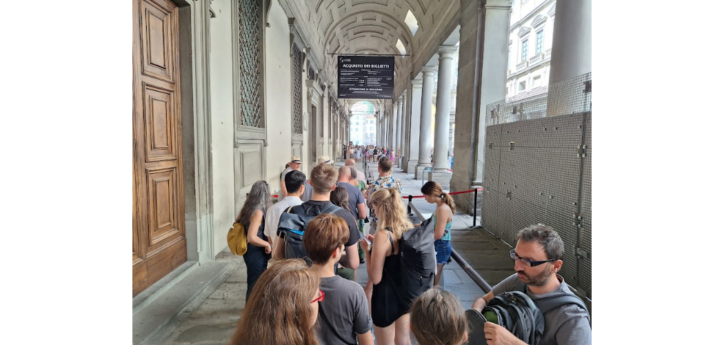 Biztos, ami biztos alapon már hetekkel az utazás előtt megrendeltem a hivatalos weboldalon a belépőjegyeket, amihez meglepetésemre meg kellett adni valamennyiünk nevét és személyes adatait. Fizetés után elektronikus úton érkezett egy visszaigazolás, amit a helyszínen az Uffizi hármas számú jegypénztárában kezeltek, ott kaptuk meg a hivatalos belépőjegyeket. Megnyugvással töltött el, hogy a 16 éves nagylányom a képtárat ingyenesen látogatta, igaz, egy 4 eurós kezelési költséget - szervízdíjat - elkérnek az elsőbbségi kezelés miatt. Hiába, ingyen ma már semmit nem adnak, főleg a világ egyik leglátogatottabb helyszínén. A foglalt időpontunk délelőtt tíz órára szólt, s az apró jegyekkel a kezünkben egy hosszú sorba kellett állnunk, de az megnyugtató volt, hogy számos ponton múzeumi munkatársak segítették az eligazodást. Látszott, hogy rutinos itt mindenki, nyugodtan, de határozottan kezelték a hömpölygő tömeget. Az épületbe szinte percre pontosan léptünk be, s reptéri ellenőrzést meghazudtoló folyamat utánjutottunk az Uffizi földszinti folyosóira.