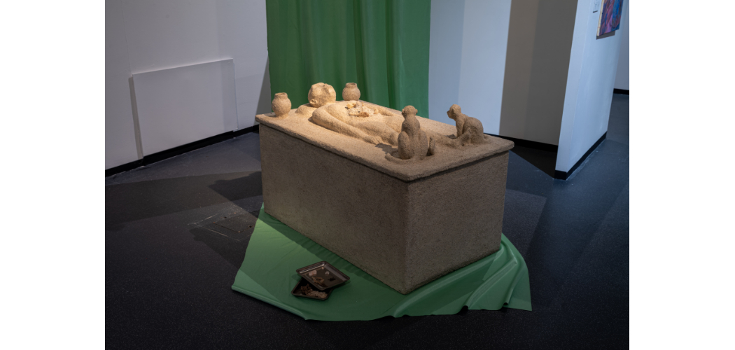 Tranker Kata - Lucy in the Sky with Diamonds (2021, installáció, papírmassza, zúzott kő, ipari ragasztó, homok, hegyi kristály, alga, fém, lánc)