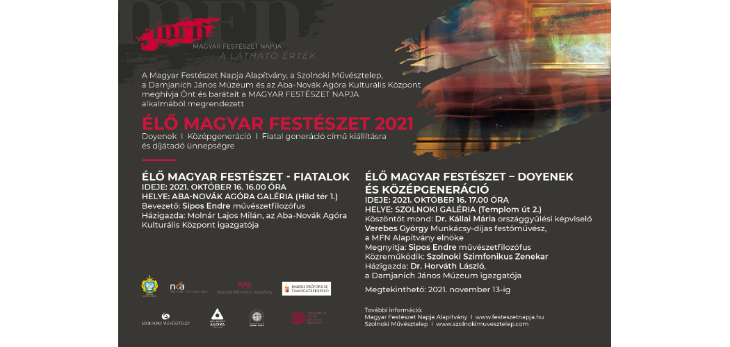 Az idei év fő kiállítása és egyben a szakmai díjátadónak helyet biztosító rendezvény az idén Szolnokon zajló ÉLŐ MAGYAR FESTÉSZET című országos, központi tárlat. 2021. október 16. és 2021. november 12. között látogatható az impozáns Szolnoki Galériában és az Aba-Novák Agóra Galériában. A kiállítás magába foglalja a doyenek-festőmesterek, a középgeneráció és a fiatal generáció műveit.