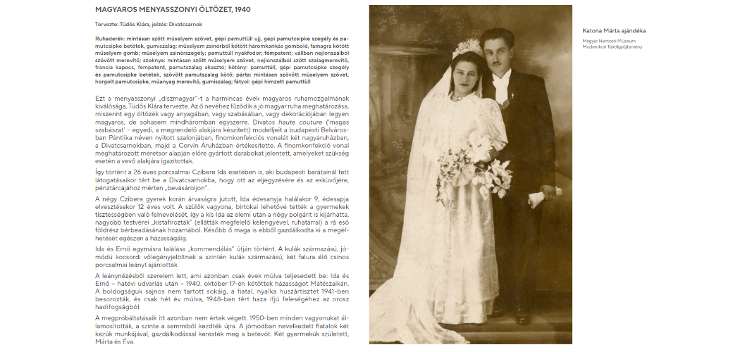 A tárlat kiemelkedő darabja a Magyar Menyasszony FB-csoportba feltöltött, abszolút közönségkedvenc esküvői fényképen szereplő ruha. A csodálatos öltözetet a magyaros divat koronázatlan királynője Tüdős Klára tervezte 1940-ben. A felbecsülhetetlen értékű emléket az eredeti tulajdonos lánya, Katona Márta a Magyar Nemzeti Múzeumnak ajándékozta. Az elmúlt két hónapban az intézmény textilrestaurátorai vették gondjaikba, konzerválták, restaurálták, hogy ezen kiemelkedő esemény alkalmából bemutatkozhasson a nagyközönségnek.
