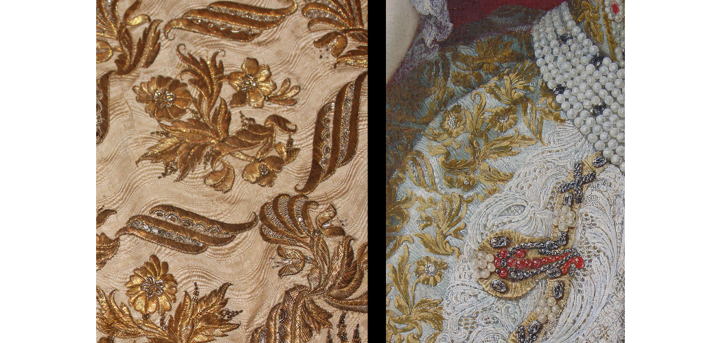 A pluviálé selyem alapszövetét aranyozott fémfonalas domború hímzés díszíti. Ha összehasonlítjuk a pluviálét Mária Terézia koronázási portréival, akkor megállapíthatjuk, hogy a festmények rendkívül pontosan ábrázolják az fémfonalas hímzés ismétlődő mintázatát, azaz rapportját: a festményeken a szoknya derékrészén jól felismerhetők a pluviálé mustráját alkotó S formájú levelek és a leveles virágtövek.