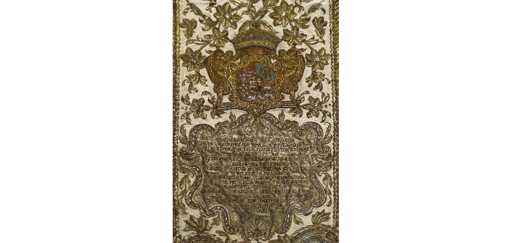 Dedikációs felirat a pluviálén Mária Terézia angyalok által tartott címerével