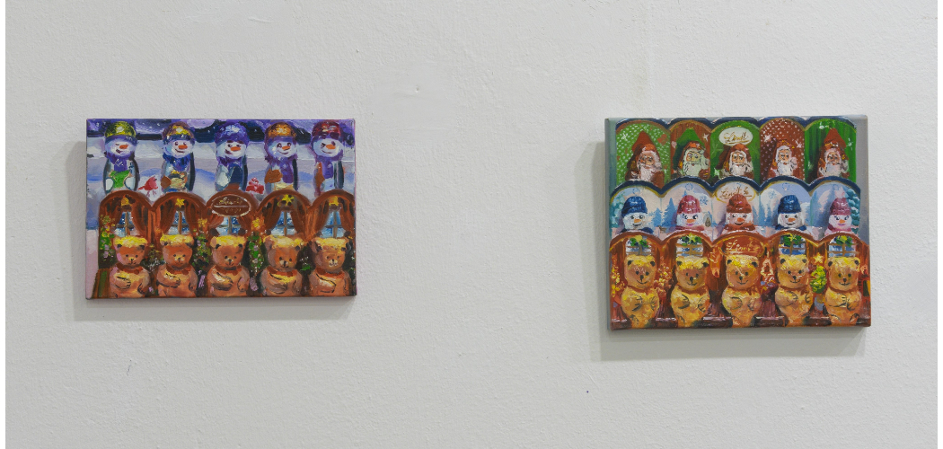 Valójában van egy konkrét eseménysor, ami megmagyarázza a kiállítás címét. Pár évvel ezelőtt a Vásárhelyi Őszi Tárlaton az egyik éppen kiállított művemet szerettem volna egy egyéni kiállításon bemutatni, viszont Képiró Ágnes – aki a jelenlegi kiállítás és katalógus kurátora-szerkesztője, a Kortárs Szolnok megálmodója – nem adhatta oda az apró festményt, hiszen a tárlaton fontos volt, hogy minden mű, főképpen a díjazott művek ott legyenek. Végül festettem egy hasonló kompozíciót, hogy a születésnapomat ünneplő Sweet 30 című kiállításon is legyen egy hasonló ritmusú kép. A beszélgetéseinkből kifolyólag találtam ki a Még egy sor medve… című képet, ami már kifejezetten a szolnoki kiállításra készült. Igazából ez az egyetlen képciklus a kiállításon, ahol nem össze-vissza heverésznek a dolgok, hanem szisztematikusan egymás mellett sorakoznak. Általános értelemben pedig úgy gondoltuk, hogy ez a ”medveség” – ami itt-ott konkrét állatok alakjában is megjelenik – jó analógiája lehet ennek az óvodás felszabadultságból is merítkező alternatív valóságnak, ami a képeimen kibonatkozik.