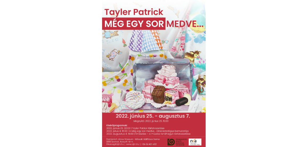 Még egy sor medve… címmel nyílt időszaki kiállítás Tayler Patrick alkotásaiból a Damjanich János Múzeumban. Harsány színekkel ábrázolt sütemények, csokoládék és gumicukrok, a gyermekkort idéző, eklektikus tárgyhalmok fogadják a látogatókat a szolnoki intézmény legújabb képzőművészeti kiállításán. Tayler Patrick festőművész csendéleteit a játékosság, a nosztalgia és egyfajta mesékre is emlékeztető történetmesélési íz is jellemzi. A festményekről a művészt kérdeztem.
