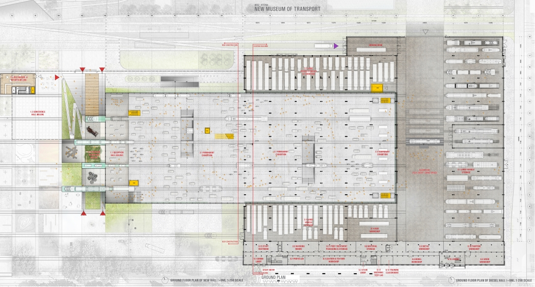 A nyertes pályamű a dízelcsarnokot új épülettel egészíti ki, amely befelé áthatja a csarnok tereit, illetve egy szinte lebegő tető alatt új múzeumi kiállítóhelyet és többszintes városi közteret hoz létre. A régi csarnokhoz csatlakozó épületszárny mintegy kihúzott fiókként enged betekintést a múzeum belsejébe, és a látogatókat bevonzza a Kőbányai út és a Könyves Kálmán körút kereszteződése felől. A kialakított közterületek karakteres, vonzó környezetet teremtenek az intézmény látogatóin túl a járókelők számára is. Az új épületrész a meglévő ipari örökségi értékeket engedi érvényesülni, megőrzi és újrahasznosítja a csarnok karakteres belső tereit, valamint legfelső szintje remek kilátást nyújt a területre és az egész környező városrészre.