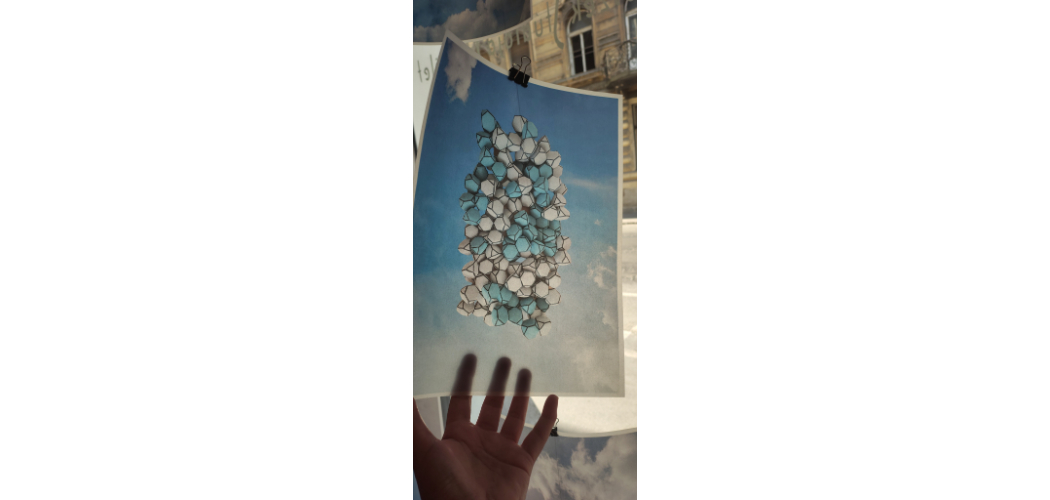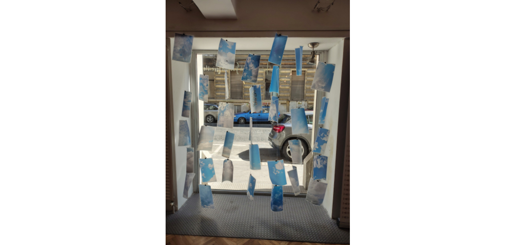 A már véget ért kiállításnak otthont adó galéria egyik ablakában feltűzött pauszpapírokat láttunk, többségükben mindkét oldalukon felhőfotókkal. A projekthez egy Instagram oldal is készült (@abovemeisthesky). Ez a fajta megjelenítési mód a játékosság kifejezését és a nézők által észre nem vett torzulások megjelenítését célozta – emelte ki a tárlaton Söptei Eszter textilművész.