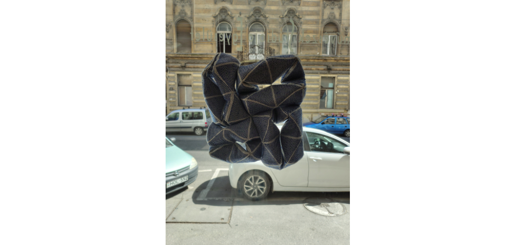A galéria másik ablakában egy, már nagy felületen is elkészült, akusztikát javító textil mintadarabot találtunk, jacquard szövetekből. A terek visszhangosságát csökkentő, a szövegérthetőséget javító, dinamikus mozgásra képes anyag egy kötött, tetraéder formájú textilpárnákból építkező alkotás, mely különböző színes, folyamatosan változó mintázatokkal kaleidoszkópszerű ciklusokból áll. Textilessége és lágysága annak ellenére megmaradt, hogy grafikai megoldásaival vizuálisan éles hatást kelt. Ennek a tetraédernek a torzított, kicsinyített változatával, a megformált textil legkisebb egységével mutatott geometriai rokonságot, a galéria középpontjában található Burjánzás nevű alkotás. A csonkított tetraéder célja kitörni a szabályrendszerből, a nagy összefüggésekből, ezért is teljesen szabálytalanul sorolt és összetett alkotás, amely folyamatosan növő, egymástól független elemekből épül fel. Technikailag és gondolatiságát tekintve egyaránt a tűréshatárt feszegeti, amelyekben az elemek súlyt és tömeget képviselnek.