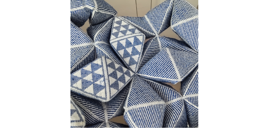 A textilművész jellemzően kisebb mennyiséget rendel és hazai magyar gyárakkal dolgozik. Az alapegységek szabásmintájának megtervezése is egyedi, ahol a szabászati hulladék visszaépítésre kerül a textíliák belső szövetébe. A geometrikus formák palástja sem készen kapható anyagokból készül, hanem az alkotó saját egyedi koncepcióját követi – speciális kontúrok, kitöltés, felület, formák és anyagokkal. Alapjuk az ipari gyapjúfilc és a jacquard szövet, a belsejükben szivacs burok, azon belül pedig szálas anyagok vannak elhelyezve. A leesett, vágott anyagokból is születik másik alkotás, a maradékból egyéb alternatív, egyszerűen kivitelezhető párna formák is kivághatók, minimális szabászati hulladékkal a Burjánzás alapanyaga esetében.