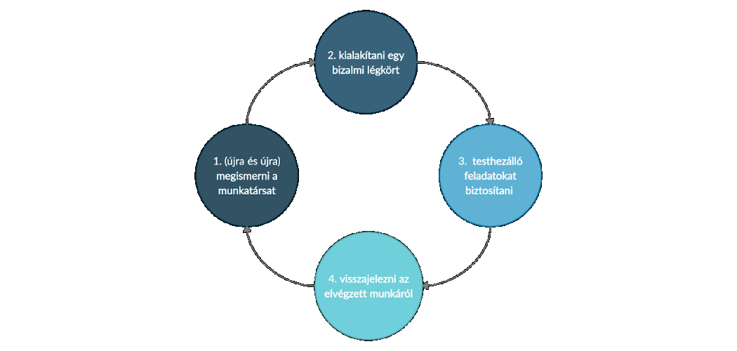 Azért, hogy a munkatársi életciklus, a munkatársakkal való kapcsolat dinamikusan érzékelhetővé váljon, hogy a ciklikusságát szemléltessem, készítettem egy ábrát főként a Múzeumok Ma 2020 kutatás fő eredményei alapján. Ebből jól követhető, hogy a munkatársak megismerését követően (és akár egy belső kompetencia-térkép készítésén túl, amely a szervezetet a váratlan helyzetben a rugalmas és gyors reagáláshoz segítheti hozzá) van még bőven munka a bizalom építésével: mentoring, belső kommunikáció, következetesség kulcsszavakat teszem ide. Ebben a felmérésben, de a fiatalok elhelyezkedési szempontjait kutató felmérésből is kiviláglik, hogy a jól és sikeresen elvégezhető munka erősíti a munkatárs elkötelezettségét, és igenis táplálja azt az érzést, hogy a helyén van, jó helyen van. Ehhez hozzáteszem, hogy fontos, hogy a feladatkiosztás egyértelmű keretek és elvárások mellett (mit, miért, hogyan) történjen - ez tovább segíti az eligazodást, és kevesebb teret hagy a találgatásra és az informális csatornák használatára. Ezt a ciklust zárja az az aktus, amikor a vezető (és a munkatárs) értékeli a teljesítményt az eddigiek tükrében. Ez nemcsak az egyén, de a szervezet számára is fontos tanulságokat hordozhat. Innen a körforgás újraindul: ahogy mi is tanulunk és alakulunk, úgy a szervezet is alakul (jó esetben) és tanul. Ez a ciklus ideálisan tehát egy felfelé nyitó spirállá alakul.