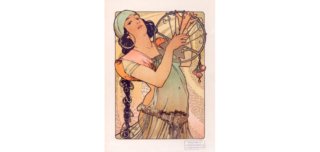 Alfons MUCHA: Nő hangszerrel, é. n. litográfia, 403×305 mm