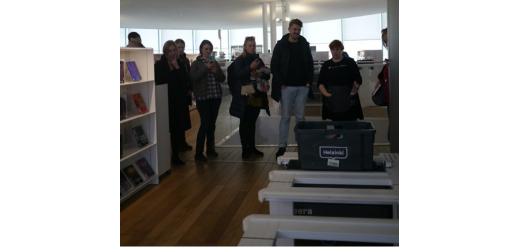 A csapat figyeli a könyvtár Veera nevű robotjának könyvszállító munkáját. Forrás: CREMA project, Suomenmuseoliitto