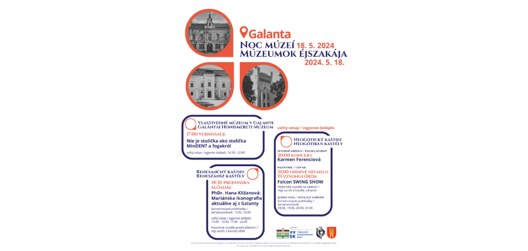 A Galántai Honismereti Múzeum ismét bekapcsolódik a Múzeumok Éjszakája összeurópai programsorozatba 2024. május 18-án. Ezúttal a Városi Művelődési Központtal együttműködve szervezik a programokat a város három nevezetes pontján: a múzeum főépületében kiállításmegnyitóra, a reneszánsz kastélyban előadásra, a neogótikus kastélyban koncertre és tűzzsonglőrök bemutatójára kerül sor, és veterán autók is láthatóak majd a két kastély körül. A programokra 13:00-tól 22:00-ig várják a látogatókat. A belépés ingyenes.