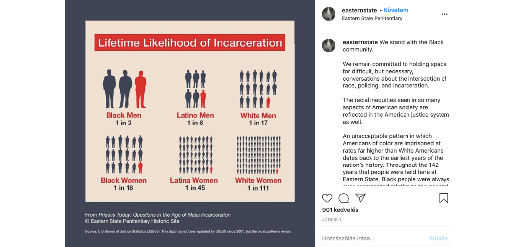 Az Eastern State Penitentiary börtönmúzeum instagram posztja, mely kiáll a Fekete közösségek mellet és rávilágít az amerikai börtönrendszer diszkriminatív voltára., forrás: instagram.com