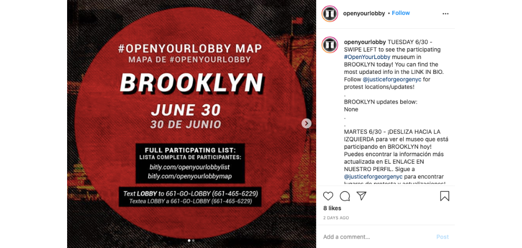 Június elején Open Your Lobby! szlogennel online kampány indult, mely arra kérte a közintézményeket, hogy segítsék a tüntetők védelmét avval, hogy megnyitják előttük előcsarnokaikat és mosdóikat. A koronavírus-járvány hatására bevezetett rendkívüli intézkedések miatt az amerikai nagyvárosokban a vendéglők, üzlethelyiségek, kulturális és egyéb nyilvános helyek zárva voltak/vannak, így a tüntetőknek nem volt/nincs hova fordulniuk, ha éppen mosdót kellett/kellene használniuk, vízre, esetleg ételre volna/van szükségük vagy ha a nagy hőségben árnyékra szorulnának. Az előcsarnokok megnyitásával a kulturális közintézmények emberhez méltó körülményeket tudnak teremteni az egyenlőségért békésen tüntetőknek. A New York-i Brooklyn Múzeum a múzeumok között elsőként csatlakozott a kezdeményezéshez. A nyitott közintézmények listája mindenki számára elérhető és az igénybe vehető szolgáltatások mellett tartalmazza az intézmény házirendjét is. A szabálypontok között a leggyakoribbak a távolságtartást és a maszk viselését előíró rendelkezések.