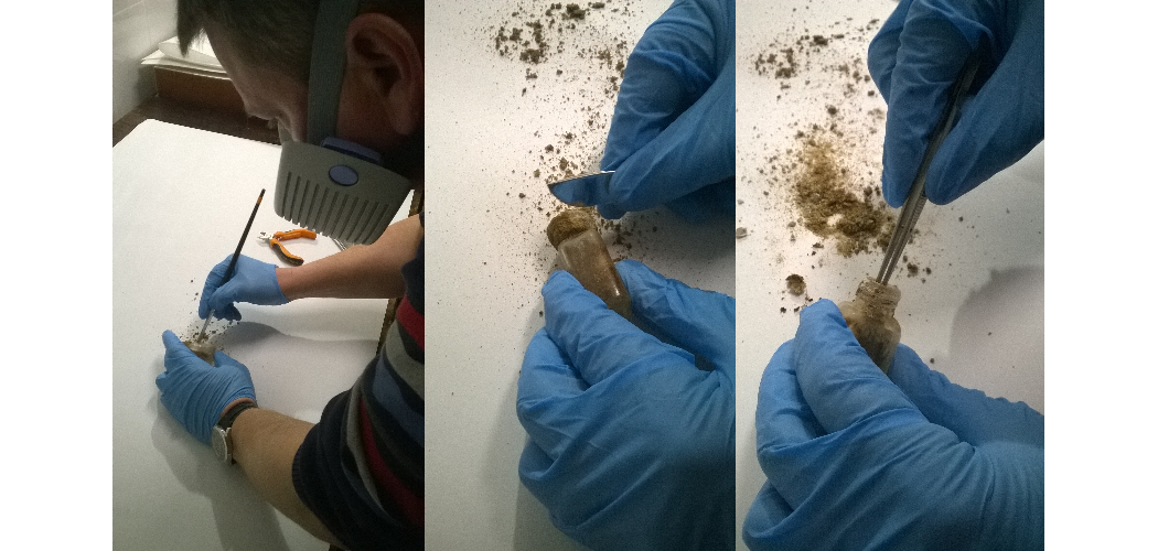 Egy, a bajai második világháborús hadifogolytáborból származó „sírüvegcse” felnyitása a Hadtörténeti Múzeumban (a képen: Tombor Krisztián restaurátor, HM HIM)