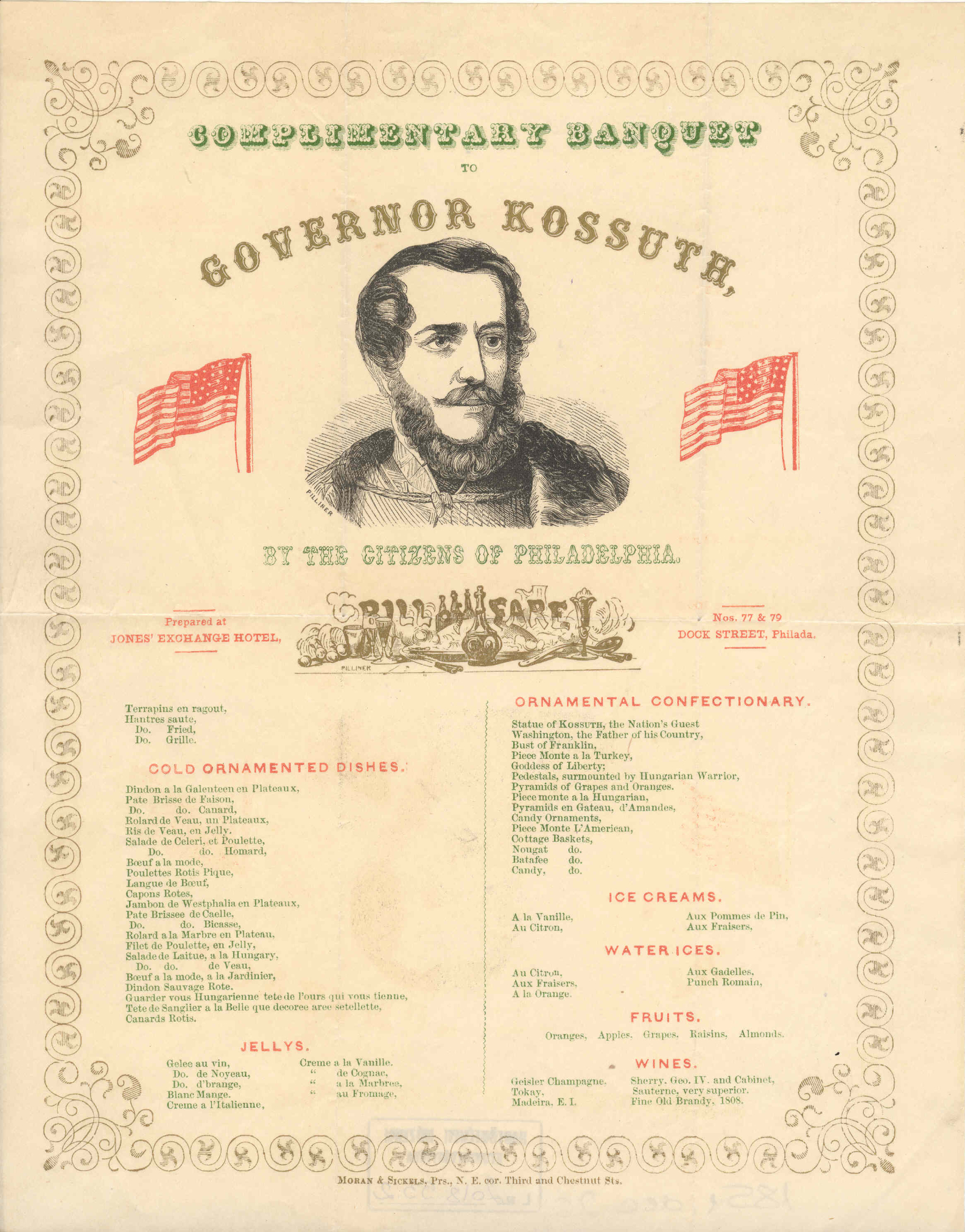 A Kossuth arcképével és amerikai zászlókkal díszített szórólap, 1851. december 26. Leltári szám: 2018.53.2/Nyt