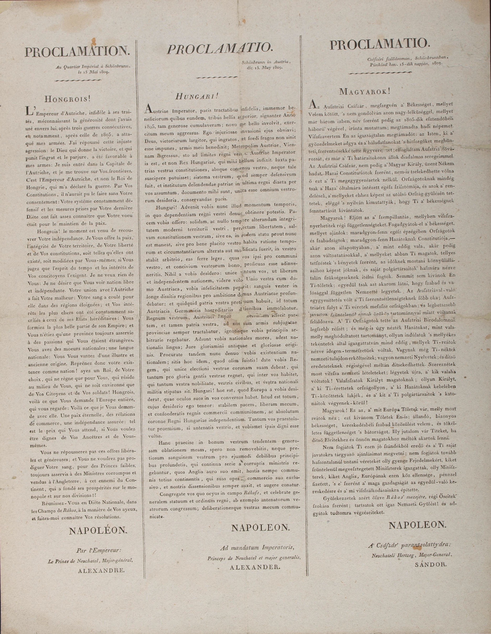 Bonaparte Napóleon felhívása a magyarokhoz, Schönbrunn, 1809. május 15. Leltári szám: 6491/Nyt