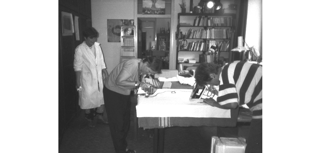 Az 1996-ban nyílt Baranya Népművészete című kiállítás előkészületei.