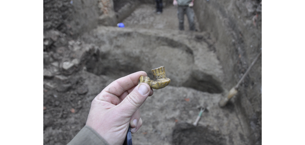 Török kori mázas díszítésű cseréppipa a külsővárat a huszárvártól elválasztó palánkszakasz feltárásából.