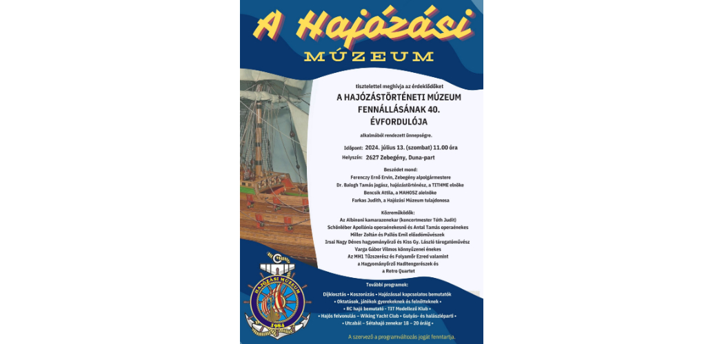 A Farkas Vincze hajóskapitány által létrehozott zebegényi magánmúzeum alapításának 40. évfordulója 2024. július 12-én lesz, amit méltó módon kívánnak megünnepelni, egy olyan rendezvénnyel, ami az eddigi munka eredményét bemutatja, egyben lezárja ezt a szakaszt és emlékezetes marad.
